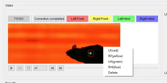 Модуль интерактивной коррекции следов позволяет обнаружить ошибку, нажимая на кнопку покадровой коррекции и перемещая индикатор выполнения и т. д. После коррекции можно перезапустить процесс обнаружения, что значительно повысит точность анализа походки.
