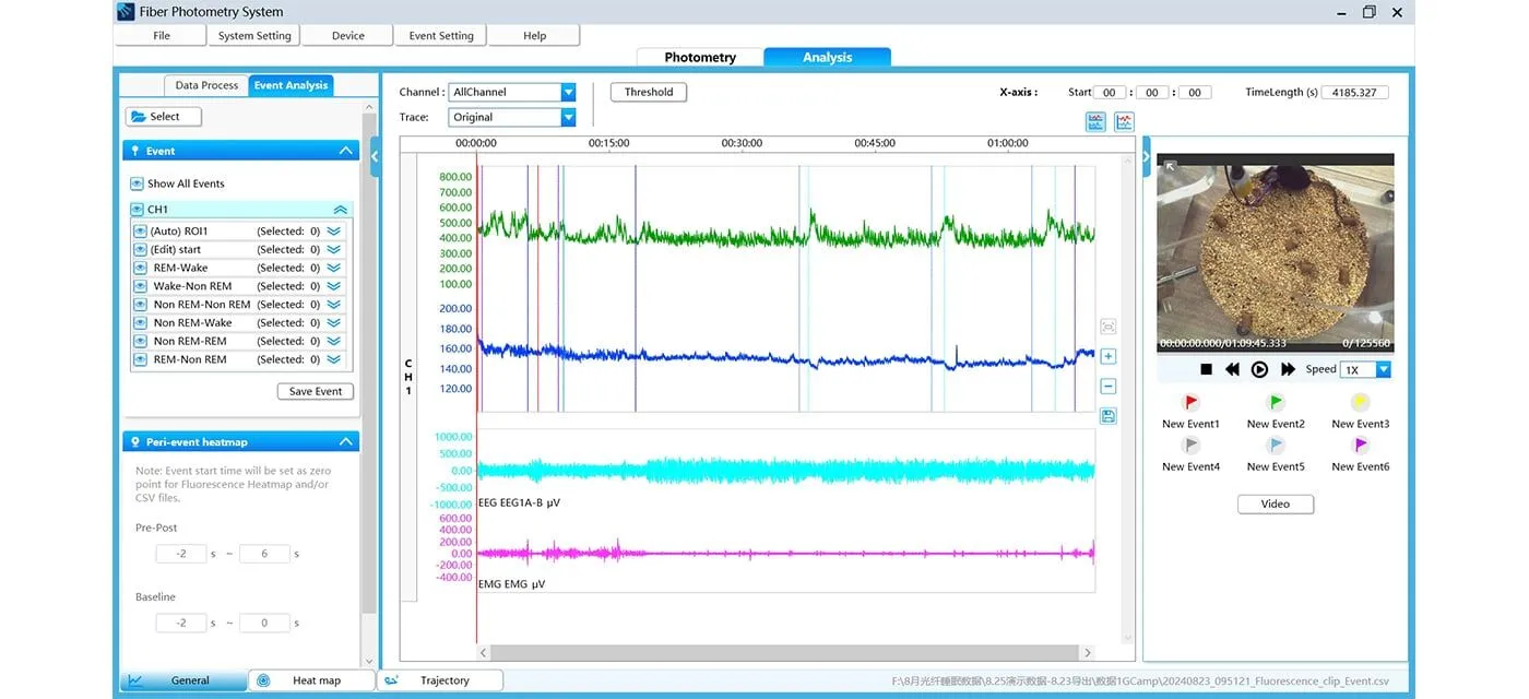Трехцветная многоканальная оптоволоконная фотометрическая система R821 совместима с оптоэлектронным оборудованием. Она имеет различные длины волн возбуждающего света: 410 нм, 470 нм или 560 нм, из которых 410 нм используется для получения опорного сигнала и устранения шума. Система может записывать сигнал зеленого флуоресцентного индикатора, такого как GCaMP и dLight, или зонда для нейромедиаторов, а также красного флуоресцентного индикатора, такого как RCaMP, jrGECO1a, или зонда для нейромедиаторов.
