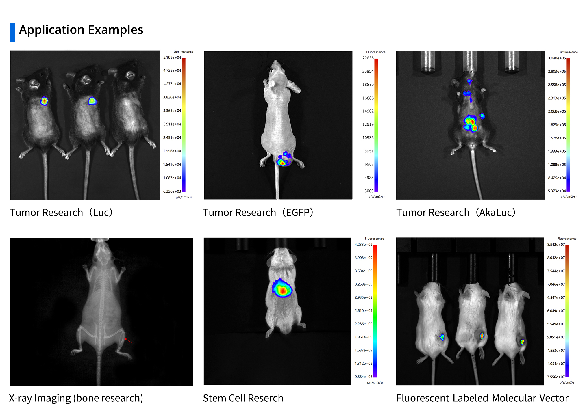 Экспериментатор может выбрать соответствующие функциональные модули в зависимости от потребностей эксперимента. В действительности можно использовать несколько модулей визуализации одновременно. Этот метод широко применяется в генной терапии стволовых клеток, разработке генных препаратов, создании вакцин на основе нуклеиновых кислот, выявлении паттернов опухолей, скрининге и оценке новых лекарств, исследованиях регуляции экспрессии генов, тестировании устойчивости штаммов, выявлении паттернов вирусных инфекций, отслеживании флуоресцентно меченых молекулярных векторов и т. д.