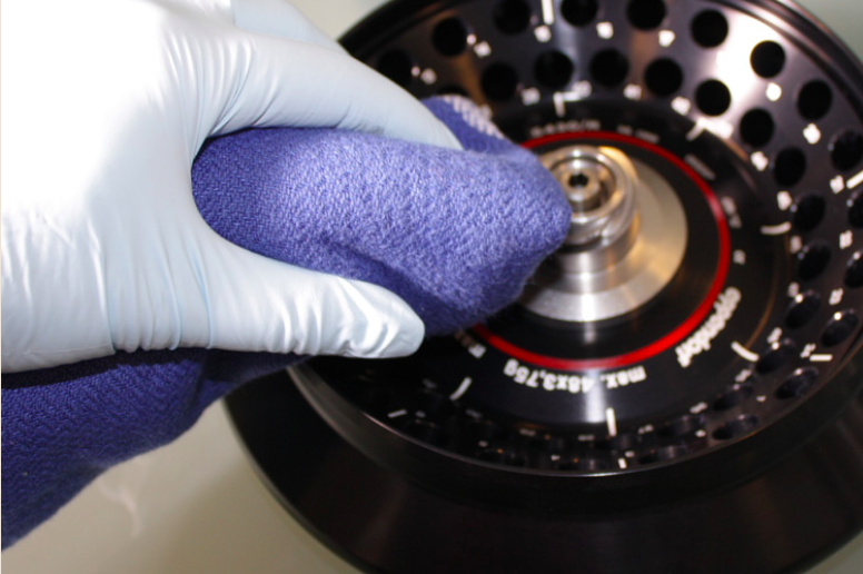 Рисунок 2: Протрите внешнюю поверхность центрифуги и очистите камеру ротора и сам ротор влажной тканью с нейтральными моющими средствами.