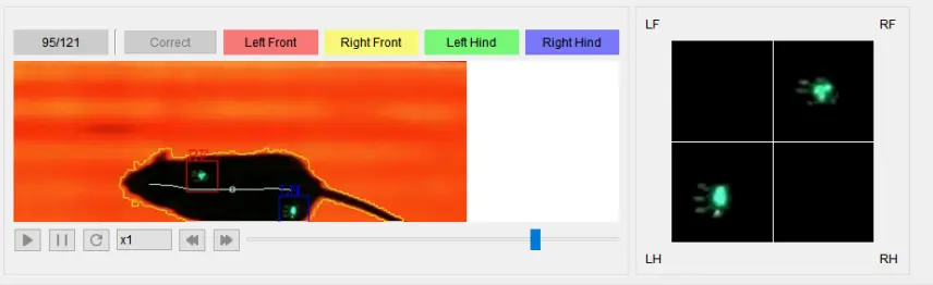 Модуль интерактивной коррекции следов позволяет обнаружить ошибку, нажимая на кнопку покадровой коррекции и перемещая индикатор выполнения и т. д. После коррекции можно перезапустить процесс обнаружения, что значительно повысит точность анализа походки.